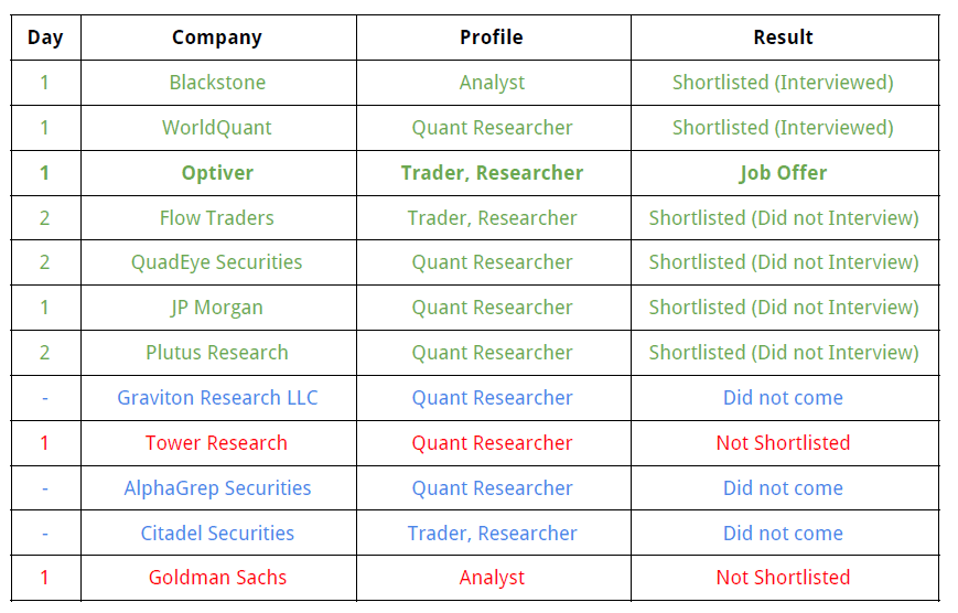 Almost all my tests went well, and with the exception of 1-2 companies, I got shortlisted in almost all of them. The test for WorldQuant was brilliant, with fixed time limit for each question, and the question themselves were excellent. I had a good time giving the test. I felt quite stupid in the tests for Tower and Goldman Sachs, since they asked coding questions and having not prepared anything for coding at all, I could not solve those relatively simple questions, and to no surprise I wasn’t shortlisted in them.